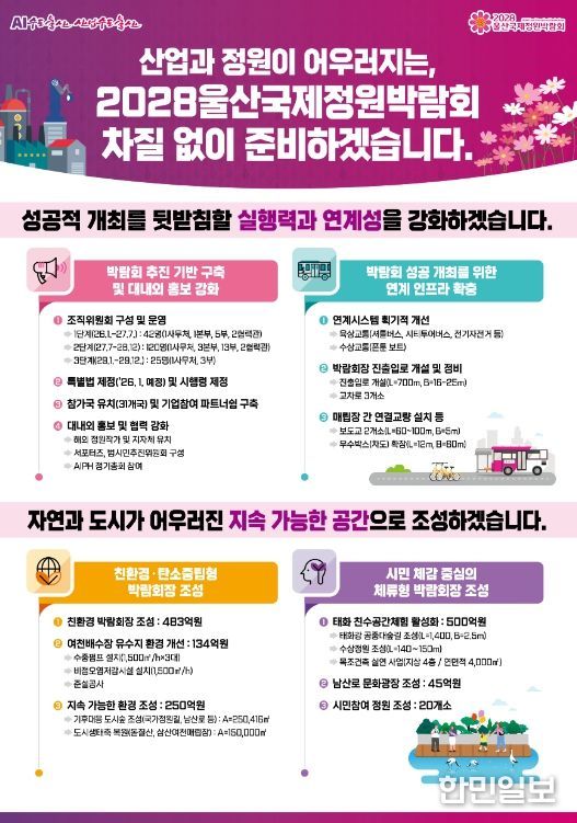 한민일보 서울포커스 임경복 기자 | 2028울산국제정원박람회 조직위원회는 2026년 한 해 동안 ‘산업에 정원을 수놓다’라는 이상(비전) 아래 2028울산국제정원박람회 성공 개최를 위한 준비에 행정 역량을 집중한다.