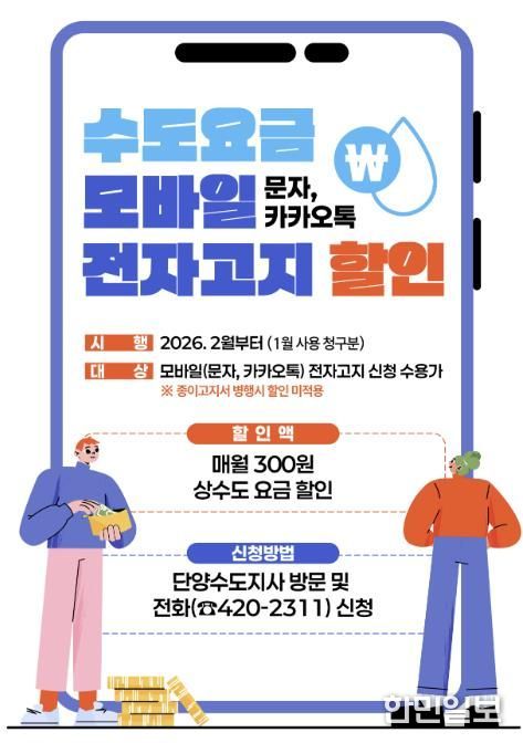 한민일보 서울포커스 김다남 기자 | 단양군은 종이 고지서 발송에 따른 행정비용과 환경 부담을 줄이고, 군민의 요금 납부 편의성을 높이기 위해 수도요금 모바일(문자·카카오톡) 전자고지 할인 제도를 오는 2월부터 시행한다고 밝혔다.