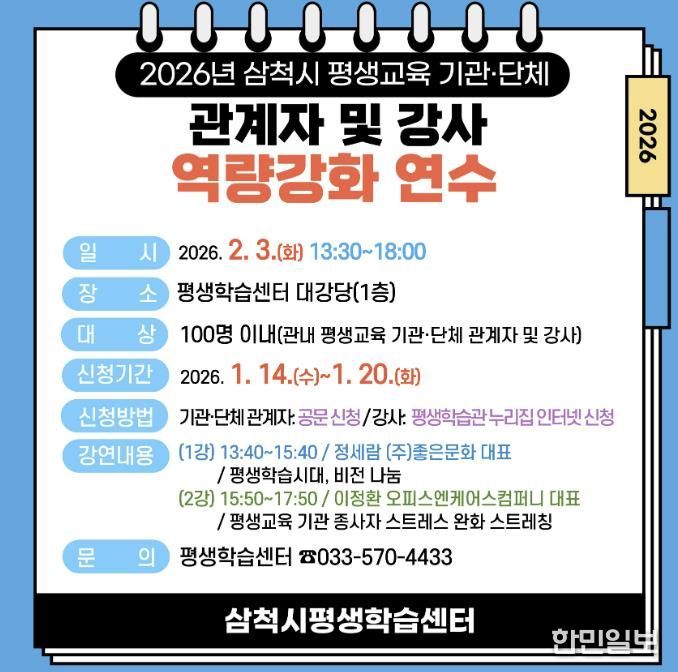 한민일보 서울포커스 임경복 기자 | 삼척시는 관내 평생교육 기관·단체 관계자와 강사를 대상으로 촘촘한 교육복지 실현을 위한 ‘2026년 삼척시 평생교육 기관·단체 관계자 및 강사 역량강화 연수’를 개최한다.