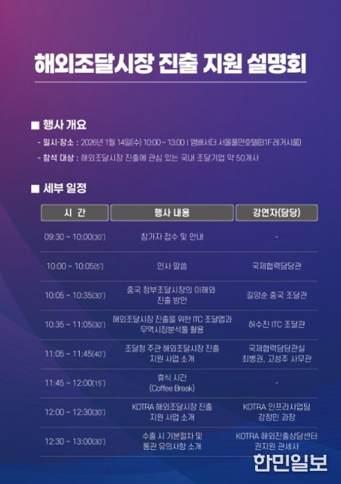 한민일보 서울포커스 임철현 기자 | 조달청은 14일 앰배서더 서울 풀만호텔에서 조달기업 60여 개사를 대상으로 해외조달관 초청 ‘해외조달시장 진출 지원사업 설명회’를 개최했다.