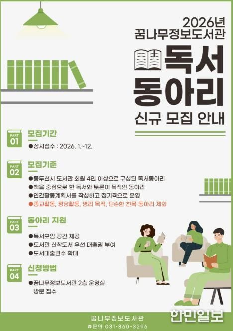 한민일보 서울포커스 임경복 기자 | 동두천시 도서문화사업소 꿈나무정보도서관은 시민들의 인문적 사고력 향상과 토론 문화 활성화를 위해 2026년 신규 독서동아리를 모집한다고 밝혔다.
