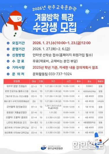 한민일보 서울포커스 임경복 기자 | 원주교육문화관(관장 용석태)은 1월 21일부터 23일까지 관내 초·중학생을 대상으로 겨울방학 특강 수강생을 모집한다.
