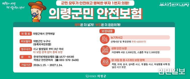 한민일보 서울포커스 김은금 기자 | 의령군은 일상생활 중 예기치 못한 재난과 사고로부터 군민의 생활 안정을 지원하기 위해 ‘2026년 군민안전보험’에 갱신 가입하고, 1월 15일부터 본격 운영에 들어간다고 밝혔다.