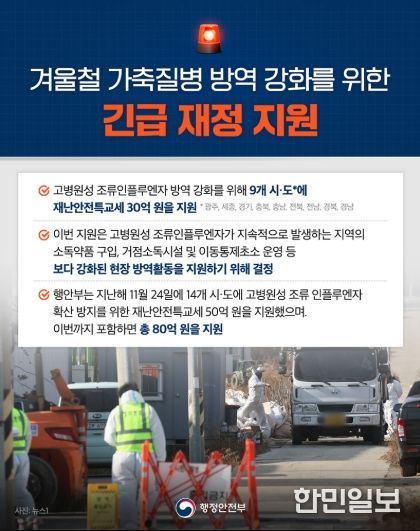 - 행안부는 지난해 11월 24일에 14개 시·도에 고병원성 조류인플루엔자 확산 방지를 위한 재난안전특교세 50억 원을 지원했으며 이번까지 포함하면 총 80억 원을 지원