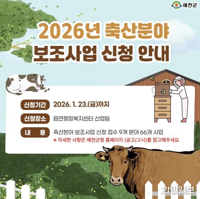 한민일보 서울포커스 임경복 기자 | 예천군은 2026년도 축산 7개 분야 66여 개의 보조사업에 대해 23일까지 읍‧면 행정복지센터에서 신청을 받는다고 밝혔다.