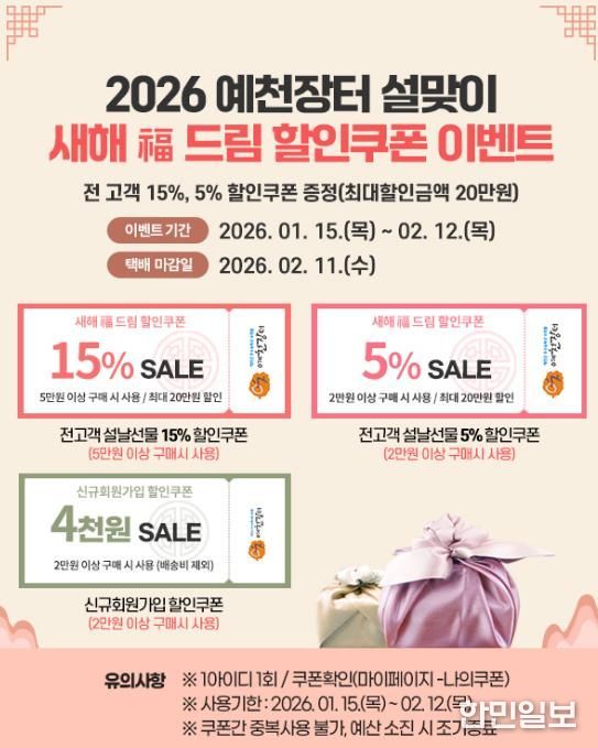 한민일보 서울포커스 임경복 기자 | 예천군은 농특산물 온라인쇼핑몰 ‘예천장터’에서 다가올 설 명절을 맞아 15일부터 2월 12일까지 설맞이 특별판매전을 진행한다.