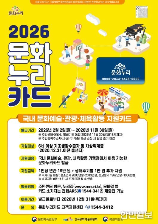 한민일보 서울포커스 임경복 기자 | 태백시는 2026년부터 문화누리카드와 청년문화예술패스 지원을 확대해 문화 취약계층과 청년의 문화 향유 기회를 넓힌다고 밝혔다.