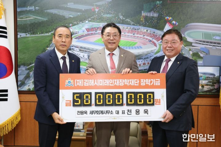 한민일보 서울포커스 김은금 기자 | 김해시미래인재장학재단은 15일 천용욱 세무회계사무소에서 올해부터 5년간 5,000만원을 기탁하기로 했다고 밝혔다.