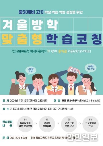 한민일보 서울포커스 임경복 기자 | 전북특별자치도전주교육지원청은 학교급 전환기를 맞은 중학교 3학년 학생들의 학습 공백을 최소화하고, 성공적인 고등학교 안착을 돕기 위해 ‘겨울방학 맞춤형 학습코칭’을 운영한다고 15일 밝혔다.