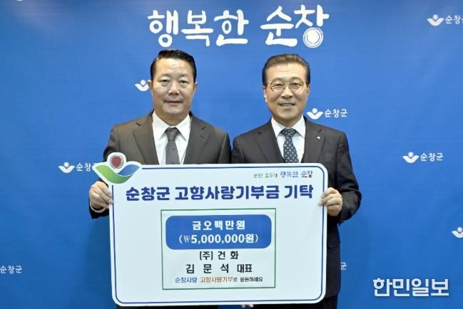 한민일보 서울포커스 김용택 기자 | 순창군은 15일 ㈜건화 김문석 대표이사가 순창군에 고향사랑기부금 500만원을 기탁했다고 밝혔다.