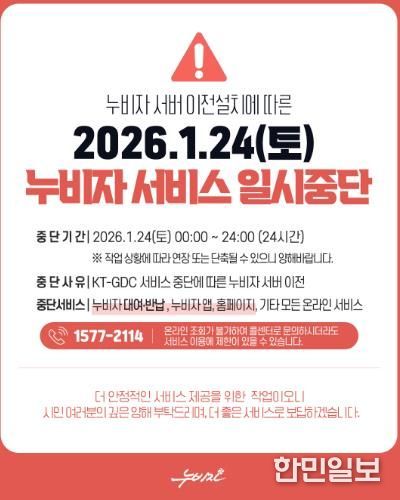 누비자 서비스는 1월 24일 00시부터 모든 대여소의 대여·반납, 누비자 누리집(홈페이지), 모바일 앱 등 온라인 서비스 이용이 일시적으로 중단된다.