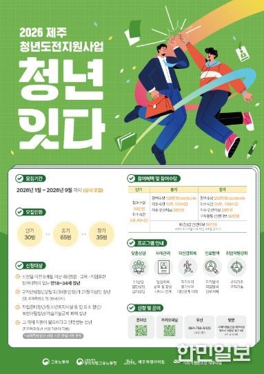 한민일보 서울포커스 임경복 기자 | 제주특별자치도가 구직 활동을 포기하거나 사회적으로 고립된 청년들의 경제활동 참여를 돕기 위해 ‘2026년 청년도전지원사업’을 오는 2월부터 본격 추진한다고 밝혔다.