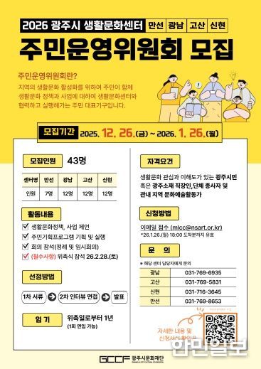 한민일보 서울포커스 임경복 기자 | (재)광주시문화재단은 광주시 생활문화센터(만선·광남·고산·신현)에서 2026년에 활동할 주민운영위원회 위원을 통합 공개 모집한다고 밝혔다.