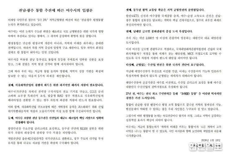 정기명 여수시장은 “여수는 과거 전국 최초로 주민발의를 통한 ‘3려 통합’을 이뤄낸 자치 분권의 상징적 도시”라며 “이번 행정통합이 여수의 정체성을 지키면서도 새로운 도약의 기회가 될 수 있도록 시민들과 함께 치밀하게 대응해 나가겠다”라고 밝혔다.