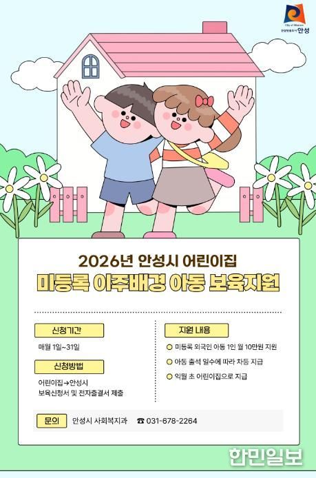 한민일보 서울포커스 임경복 기자 | 안성시는 2026년부터 어린이집에 다니는 미등록 외국인(이주배경) 영유아에게 월 10만원의 보육지원금을 지원한다고 밝혔다.