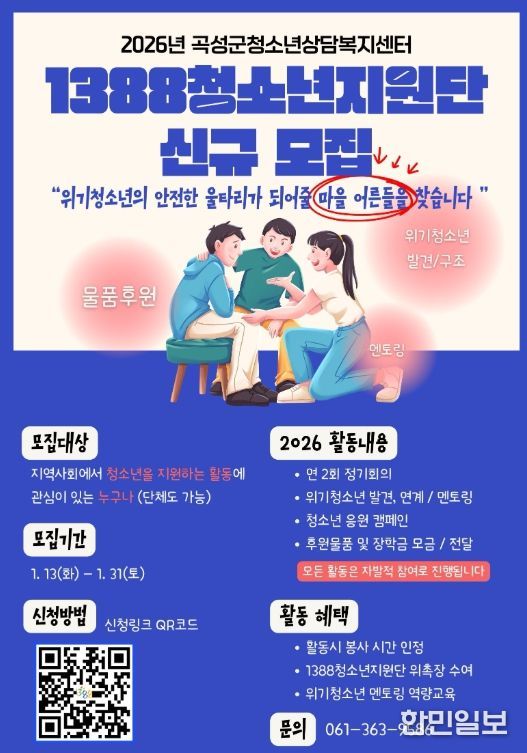 한민일보 서울포커스 박용남 기자 | 전남 곡성군은 관내 소재한 곡성군청소년상담복지센터에서 지역 내 위기청소년을 조기에 발견하고 실질적인 지원을 제공하기 위한 민·관 협력 조직인 ‘1388청소년지원단’의 2026년도 신규 단원을 모집한다고 16일 밝혔다.