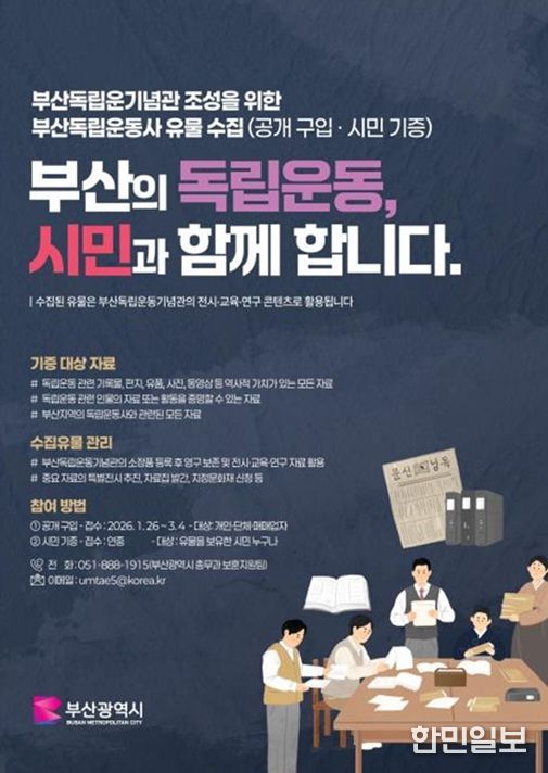 한민일보 서울포커스 임광현 기자 | 부산시는 2027년 상반기 개관을 목표로 조성 중인 부산독립운동기념관의 전시·연구·교육 콘텐츠를 완성하기 위해, 부산 독립운동사 관련 유물 수집을 추진한다고 밝혔다.