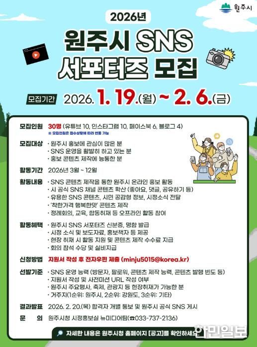 한민일보 서울포커스 임경복 기자 | 원주시는 참신한 아이디어와 열정을 가진 ‘2026년 원주시 SNS 서포터즈’를 다음 달 6일까지 모집한다.