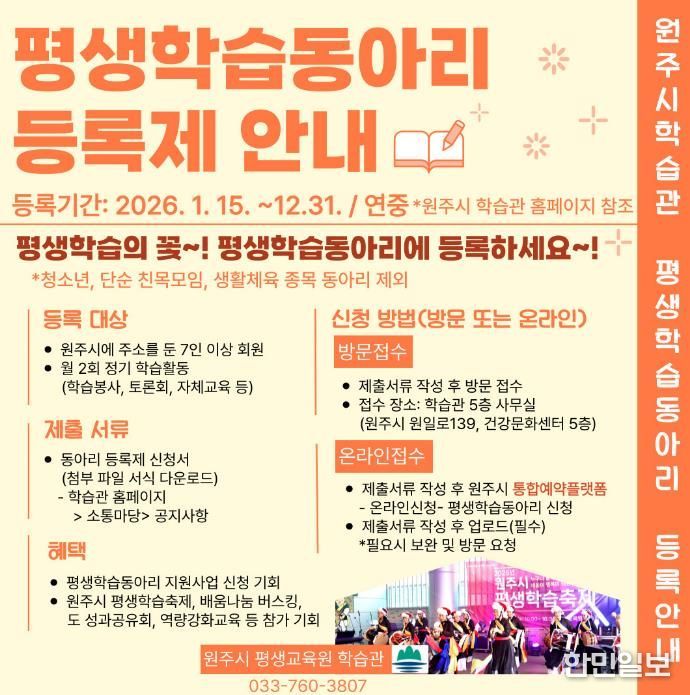 한민일보 서울포커스 임경복 기자 | 원주시 평생교육원 학습관은 관내에서 활동하고 있는 잠재적 평생학습동아리를 발굴하기 위해 ‘평생학습동아리 등록제’를 운영하고 있다.