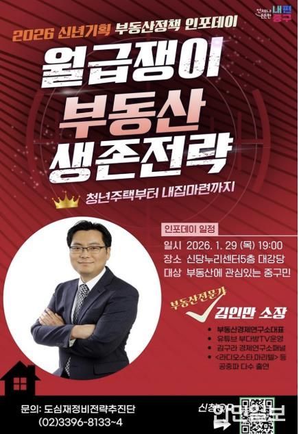 한민일보 서울포커스 김서윤 기자 | 서울 중구가 급변하는 부동산 환경 속에서 주민들의 현실적인 대응 전략을 돕기 위해 오는 29일 저녁 7시 신당누리센터 5층 대강당에서 올해 첫 도시런(learn) 스쿨‘신년기획 부동산 전략 인포(INFO)데이’를 연다.