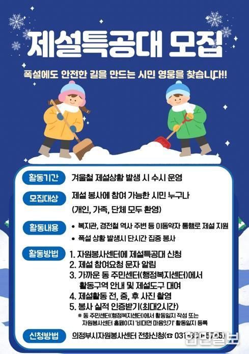한민일보 서울포커스 심기옥 기자 | 의정부시는 겨울철 폭설로 인한 시민 불편을 최소화하고 안전한 보행환경을 조성하기 위해 ‘제설특공대’를 모집한다.