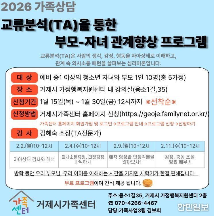 한민일보 서울포커스 김은금 기자 | 거제시가족센터는 오는 2일부터 진행하는'교류분석(TA)을 통한 부모–자녀 집단상담 프로그램' 참여자를 모집한다고 밝혔다.