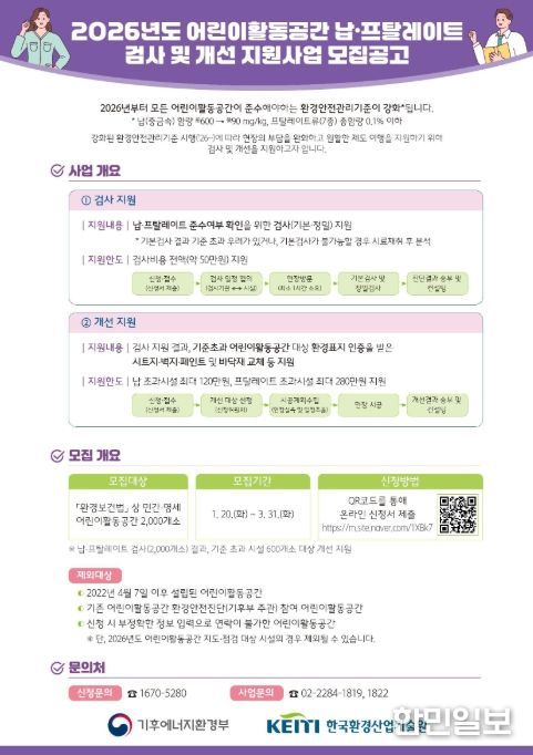 한민일보 서울포커스 진광성 기자 | 기후에너지환경부와 한국환경산업기술원은 어린이 활동공간에 새롭게 적용되는 환경안전관리기준에 따라 ‘납’과 ‘프탈레이트’에 대한 검사를 지원하고, 기준을 초과한 시설에 대해서는 개선 지원을 추진한다고 밝혔다.