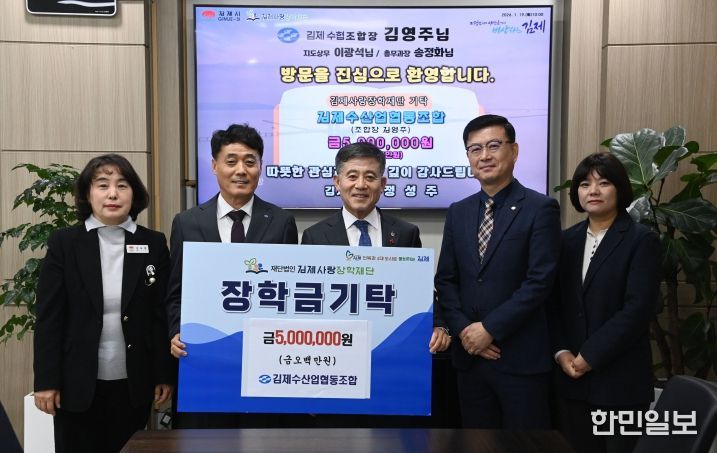 한민일보 서울포커스 박용남 기자 | 김제사랑장학재단은 19일 김제수산업협동조합(조합장 김영주)과 새만금장례식장(대표 김덕운)이 지역 인재 육성을 위한 장학금으로 각각 500만 원과 300만 원을 기탁했다고 밝혔다.