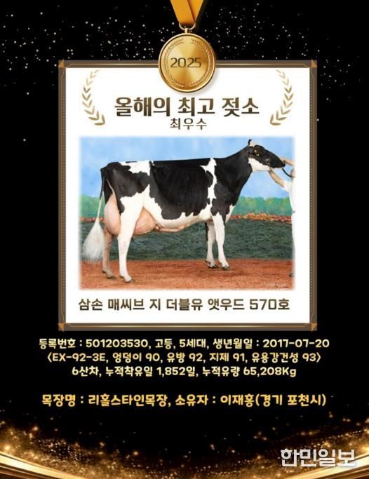 한민일보 서울포커스 심기옥 기자 | 포천시는 관내 낙농농가인 리홀스타인목장(대표 이재홍)이 2025년 ‘올해의 최고 젖소’를 배출했다고 밝혔다.