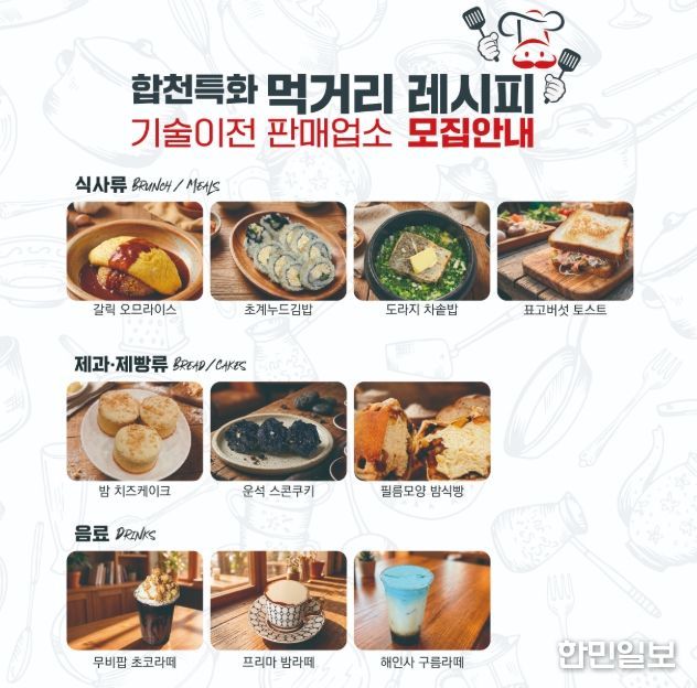 모집 대상은 합천군 내에 영업 신고가 된 일반음식점, 제과점, 휴게음식점 등이며, 기술이전을 통해 창업을 준비 중인 예비 창업자도 신청 가능하다.