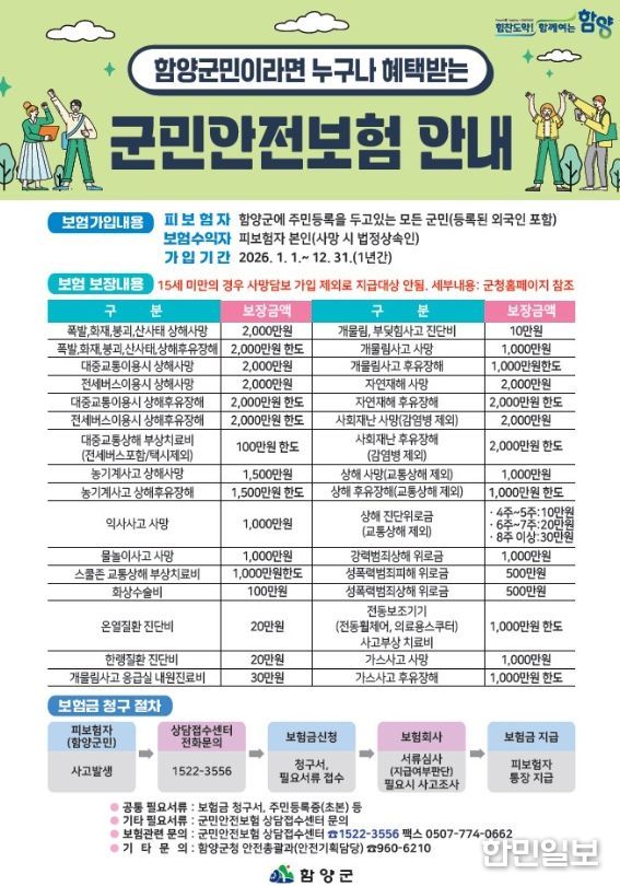 한민일보 서울포커스 김서윤 기자 | 함양군은 군민들이 일상생활 속 각종 재난·사고로부터 보다 안전하게 보호받을 수 있도록 전 군민을 대상으로 한 ‘2026년 군민안전보험’에 가입해 운영한다고 밝혔다.