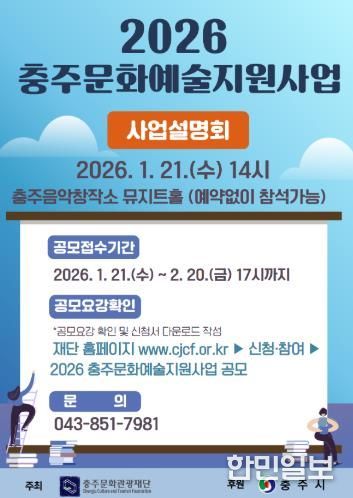 한민일보 서울포커스 김다남 기자 | (재)충주문화관광재단은 충주시 예술인 및 예술단체의 창작활동 기반을 마련하여 문화예술 생태계를 조성하고자 1월 19일부터‘2026 충주문화예술지원사업’공모를 진행하고 있다고 밝혔다.