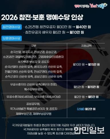 특히 2026년부터는 공상공무원, 국가사회발전 특별공로상이자 및 공로자, 재해부상군경, 재해부상공무원에게도 보훈명예수당을 신설해 월 2만 원을 지급할 예정이다.