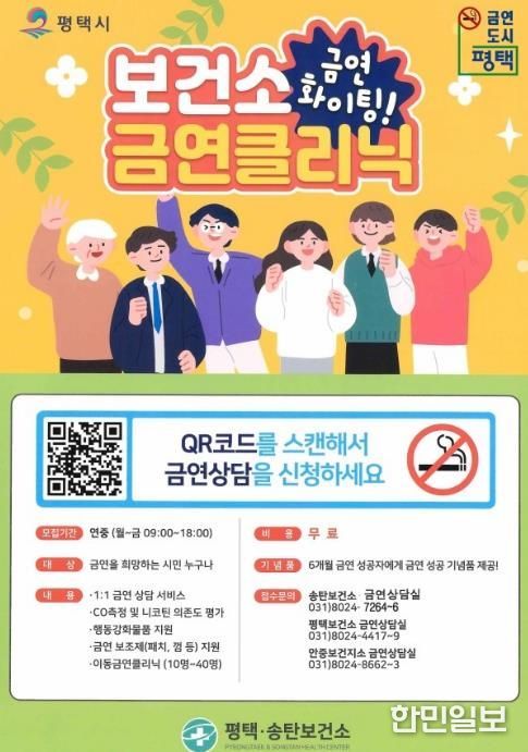 한민일보 서울포커스 황준형 기자 | 평택시는 금연을 희망하는 시민들이 금연클리닉 정보무늬(QR코드)를 통해 편리하게 금연 상담 서비스를 이용할 수 있도록 금연클리닉을 운영하고 있다.