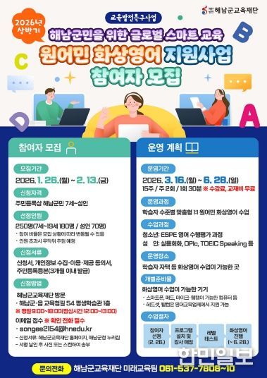 한민일보 서울포커스 박용남 기자 | 재단법인 해남군교육재단(이사장 명현관)은 상반기 원어민 화상영어 지원사업의 참여자를 모집한다. 지난 2023년부터 시작된 원어민 화상영어 지원사업은 군민 누구나 양질의 영어 교육을 받을 수 있도록 해 지역 내 교육 불균형을 해소하고, 미래 글로벌 인재 양성에 기여하기 위해 운영되고 있다.