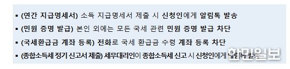 이 밖에도 명의도용으로 인한 피해가 예상되는 국세행정 업무에 대해 다음과 같은 서비스를 시행한다.