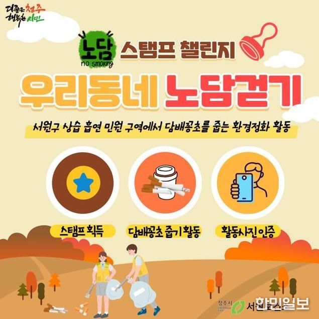‘노담걷기’는 노(NO) 담배, 즉 금연을 목표로 걷기 활동과 함께 담배꽁초를 줍는 환경정화 활동을 결합한 실천형 캠페인이다. 청주시민이면 누구나 참여할 수 있다.