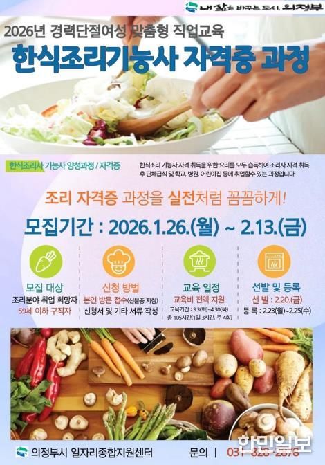 한민일보 서울포커스 심기옥 기자 | 의정부시는 경력단절여성의 안정적인 재취업을 지원하기 위해 ‘2026년 한식조리기능사 자격증 과정’ 참여자를 모집한다.