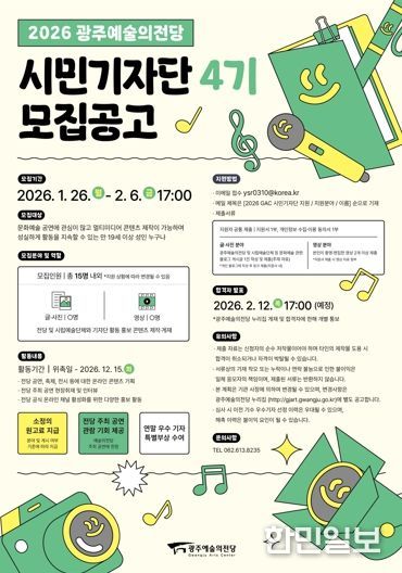 한민일보 서울포커스 임경복 기자 | 광주광역시 예술의전당은 전당의 다양한 공연 정보와 문화 소식을 직접 취재하고 공식 온라인 채널을 통해 알릴 ‘2026 광주예술의전당 시민기자단 4기’를 26일부터 2월6일까지 모집한다.