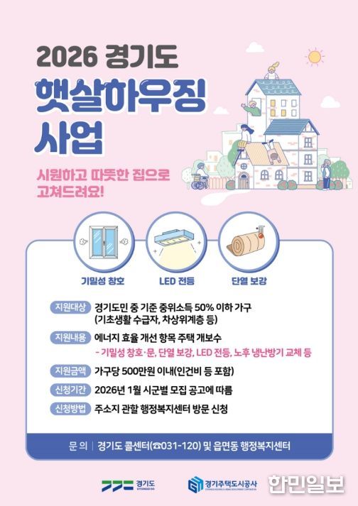 한민일보 서울포커스 김윤이 기자 | 경기도가 난방비 및 전기료 등 주거비 부담을 덜어주기 위해 2026년 햇살하우징 사업을 추진한다.