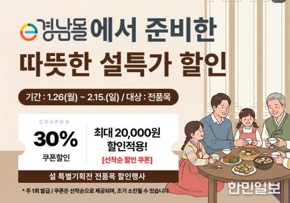 한민일보 서울포커스 임철현 기자 | 경상남도와 (재)경상남도투자경제진흥원이 운영하는 e경남몰은 1월 26일부터 예산 소진 시까지 ‘2026년 풍성한 설맞이 할인 기획전’을 진행한다.