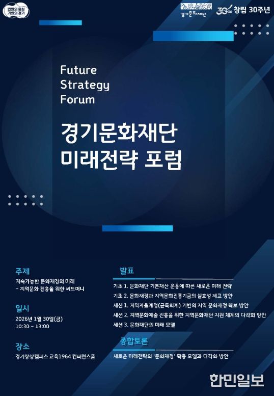 한민일보 서울포커스 김윤이 기자 | 경기문화재단(대표이사 유정주)은 창립 30주년(2027년)을 앞두고 재단의 미래 30년을 준비하기 위한 정책포럼으로 '경기문화재단 미래전략 포럼'을 오는 1월 30일, 경기상상캠퍼스 교육1964 컨퍼런스홀(수원)에서 개최한다.
