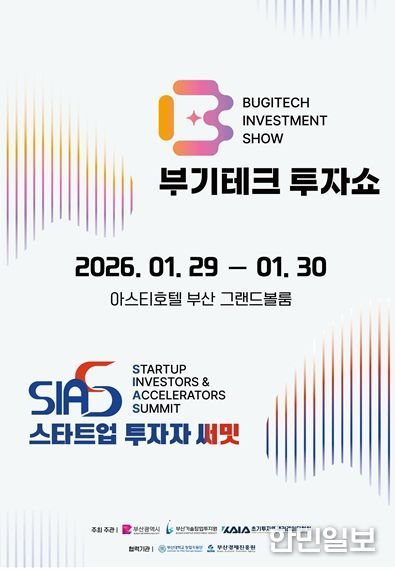 한민일보 서울포커스 임광현 기자 | 부산시는 오는 1월 29일부터 30일까지 동구 아스티호텔 부산에서 '2026년 부기테크 투자쇼 X 스타트업 투자자 써밋'을 개최한다고 오늘(26일) 밝혔다.
