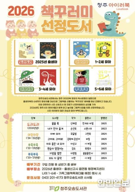 한민일보 서울포커스 김다남 기자 | 청주오송도서관은 청주시 영유아 독서운동 ‘청주 아이러북(LoveBook)’ 사업의 일환으로 2026년 영유아에게 선물할 대표도서 8권을 최종 선정했다고 26일 밝혔다.