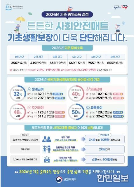 2026년 기준 중위소득이 4인 가구 기준 전년 대비 6.51% 인상됨에 따라, 생계·의료·주거·교육급여 등 국민기초생활보장 급여 수준도 함께 상향 조정된다.
