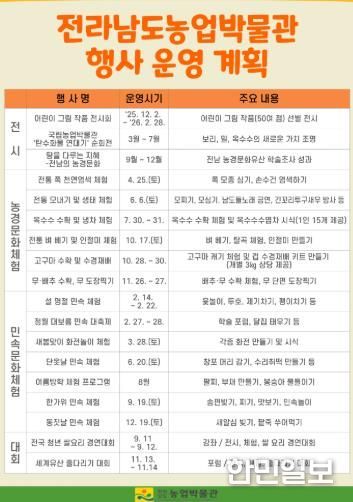 김옥경 전남농업박물관장은 “2026년은 박물관이 농업과 문화를 잇는 융합 플랫폼으로 한 단계 더 나아가는 해가 될 것”이라며 “단순히 농경문화의 가치를 지키는 데 그치지 않고, 오늘의 일상에서 새롭게 살아 숨 쉬게 하는 것이 박물관의 역할”이라고 말했다. 이어 “전통의 뿌리를 바탕으로 미래를 준비하는 ‘열린 K-헤리티지 박물관’으로서 지역민과 방문객 모두가 전남 농경문화의 가치와 매력을 함께 느끼도록 힘쓰겠다”고 강조했다.
