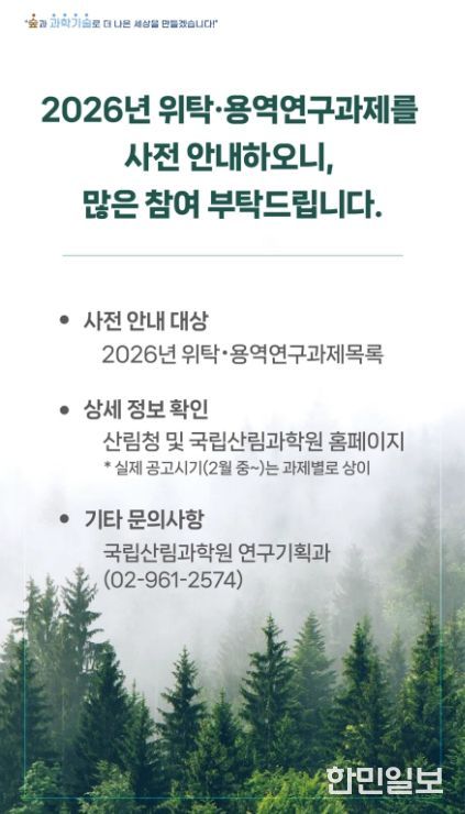 한민일보 서울포커스 진광성 기자 | 산림청 국립산림과학원은 산림 연구 인프라를 내실화하고, 대학 및 연구기관과의 전략적 협업을 확대하기 위해 2026년 위탁·용역연구과제를 사전 안내한다고 밝혔다.