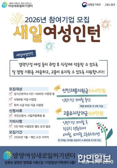 한민일보 서울포커스 진광성 기자 | 양양여성새로일하기센터는 여성들의 안정적인 고용과 직장 적응을 지원하기 위해 '새일여성인턴 사업'에 참여할 기업과 경력단절 여성 12명을 상시 모집하고 있다.