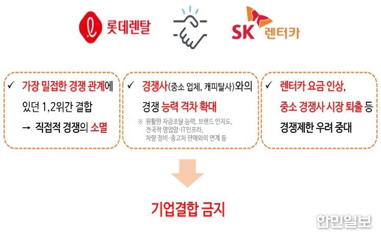한민일보 서울포커스 임경복 기자 | 공정거래위원회는 사모펀드(PEF) 운용사인 어피니티 에쿼티 파트너스 리미티드가 롯데렌탈 주식회사의 주식 63.5%를 취득하는 기업결합을 심사한 결과, 국내 렌터카 시장의 가격 인상 등 경쟁을 실질적으로 제한할 우려가 크다고 판단하여 해당 결합을 금지하는 조치를 부과했다.