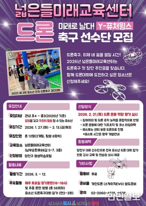 한민일보 서울포커스 곽동근 기자 | 양천구는 드론 주행 기술과 스포츠를 결합한 유소년 드론축구단 ‘Y-퓨처윙스’를 창단하고, 하늘 위에서 펼쳐지는 짜릿한 승부를 함께 경험할 창립 멤버를 오는 2월 13일까지 모집한다고 밝혔다.